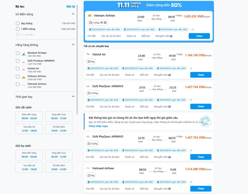 Khi tra giá vé Hà Nội Sài Gòn trên Traveloka, người dùng có thể xem chi tiết giá và giờ bay của các hãng như Vietnam Airlines, Vietjet Air, Bamboo Airways, Pacific Airlines hay Vietravel Airlines ngay trên một màn hình. Traveloka cũng thường xuyên có ưu đãi độc quyền, giúp tiết kiệm hơn so với đặt trực tiếp qua hãng. Ứng dụng còn cho phép lọc kết quả theo giờ bay, giá vé hoặc hãng hàng không, giúp việc tra cứu nhanh và thuận tiện hơn.